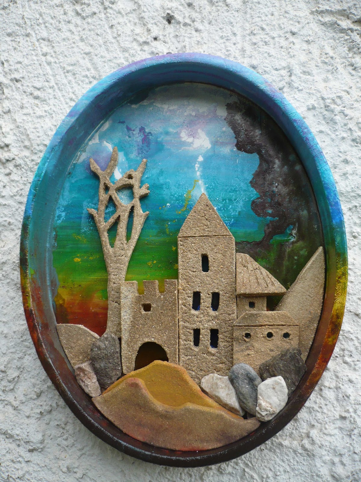 Ecco un'idea sulla quale ci impegneremo in futuro. Dei vassoi di legno utilizzati a mo' di cornice per sviluppare dei piccoli paesaggi in rilievo con uno sfondo in colori vivaci e i vari elementi composti di sfoglie di terracotta al naturale e sassi del Brenta. Il risultato è un interessante cameo di un paesaggio fantasioso e altamente decorativo. E' una bellissima idea regalo!
